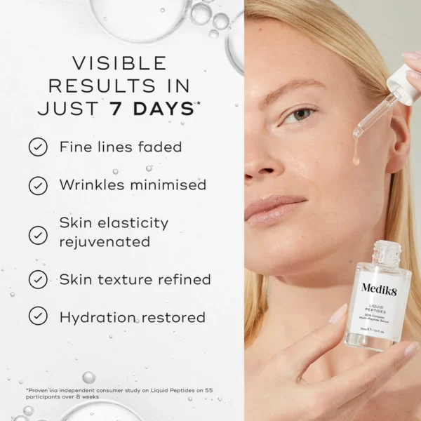 Medik8 Liquid Peptides is a lightweight, fast-absorbing serum formulated with copper peptides, amino acids, and antioxidants to improve skin elasticity, firmness, and hydration. It helps reduce the appearance of fine lines and supports the skin’s natural regeneration processes. Leaves skin smooth, plump, and revitalised with a healthy, youthful glow.